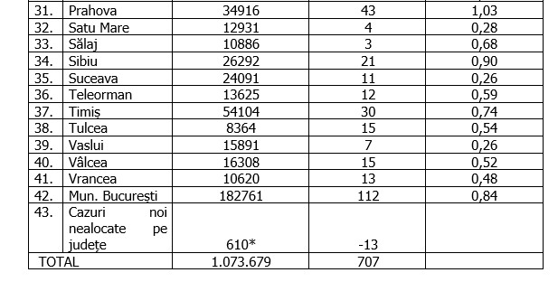 Ultima raportare a Grupului de Comunicare Strategică arată că, oficial, în România s-au înregistrat, miercuri, 707 cazuri noi de persoane infectate cu SARS-CoV-2.