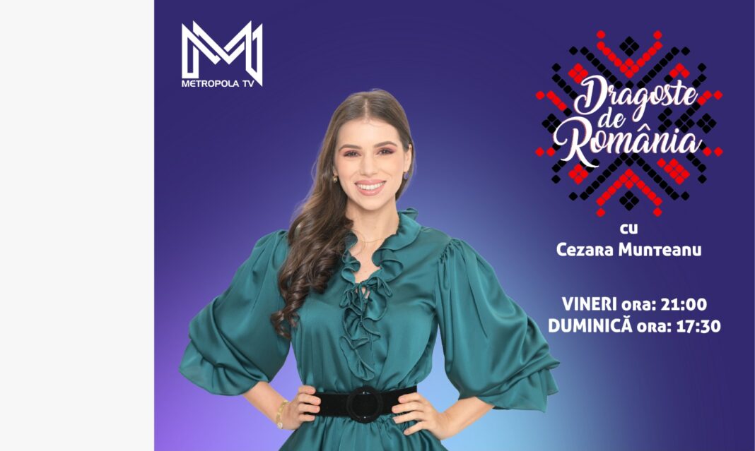 Emisiunea „Dragoste de România”, prezentată de Cezara Munteanu, revine într-un sezon nou pe Metropola TV. Vineri, 11 martie cu începere de la ora 21.00, telespectatorii vor putea intra, din nou, în poveștile frumoase scrise de-a lungul timpului pe teritoriul României, povești pe care echipa emisiunii le descoperă și, cu drag și profesionalism, le aduce în fața publicului.