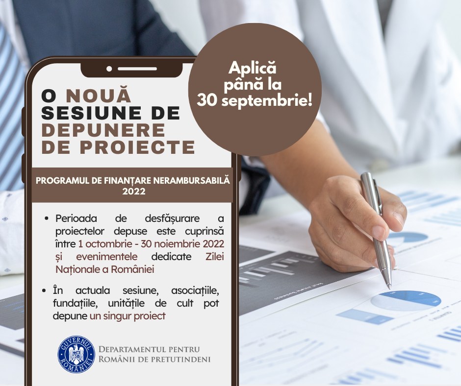 „Programul de finanțare nerambursabilă 2022 al Departamentului pentru Românii de Pretutindeni continuă!”, potrivit paginii de Facebook a instituției.