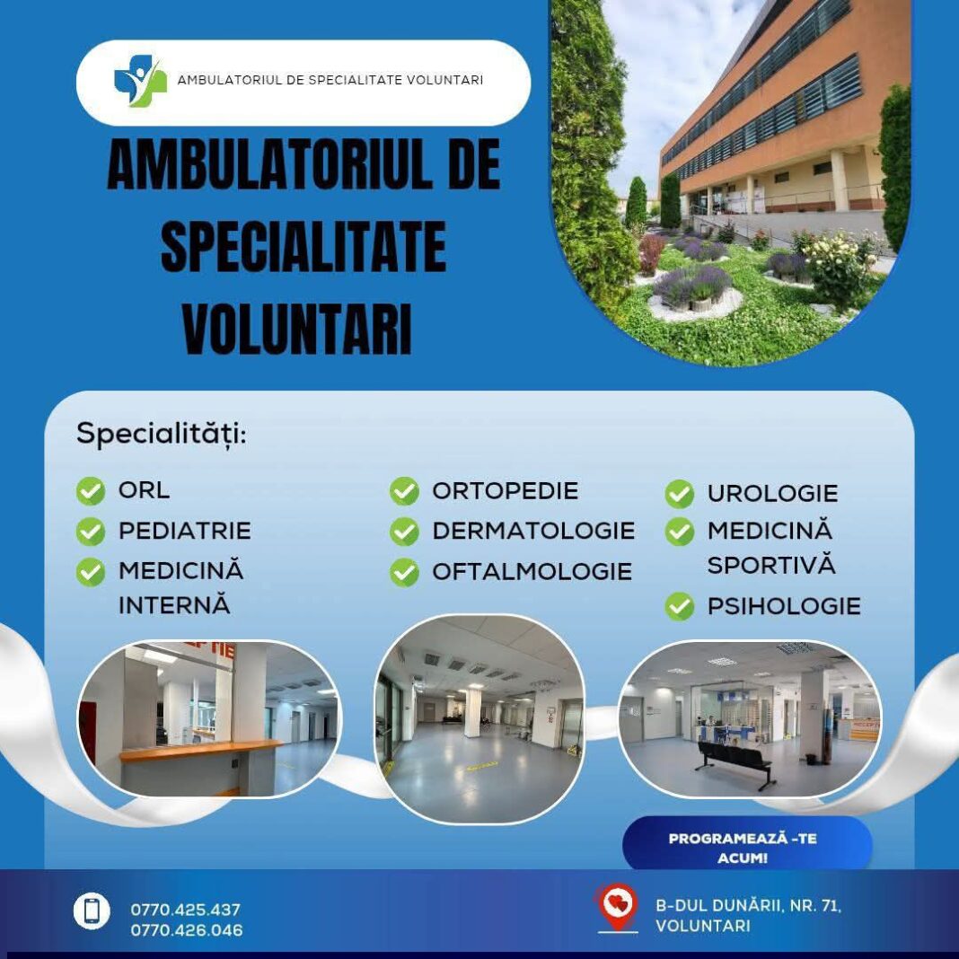 Ambulatoriul de Specialitate Voluntari reunește o diversitate de specialități medicale, oferind pacienților acces la servicii de înaltă calitate, într-un cadru profesionist și bine organizat, informează Primăria Orașului Voluntari. Fiecare specialitate este deservită de personal medical dedicat, pregătit să răspundă nevoilor individuale de diagnostic și tratament.