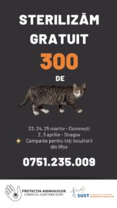 Campaniile de sterilizare vor avea loc în zilele de 23, 24 și 25 martie, în Domnești, precum și pe 2 și 3 aprilie, în Snagov. Inițiativa se adresează tuturor locuitorilor din județul Ilfov. Programările se fac la numărul de telefon 0751.235.009.