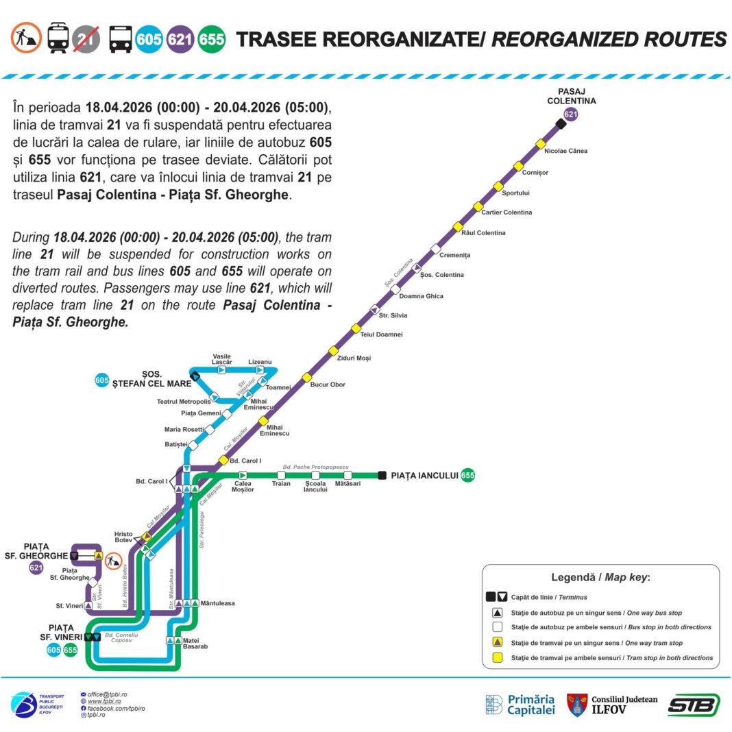 Tot în acest interval, liniile de autobuz 605,655 și N103 vor circula pe trasee modificate din cauza lucrărilor de intervenţie la macazul amplasat la intersecţia Calea Moşilor/Str. Lipscani/Str. Cavafii Vechi, informează Asociaţia de Dezvoltare Intercomunitară pentru Transport Public Bucureşti – Ilfov (TPBI).