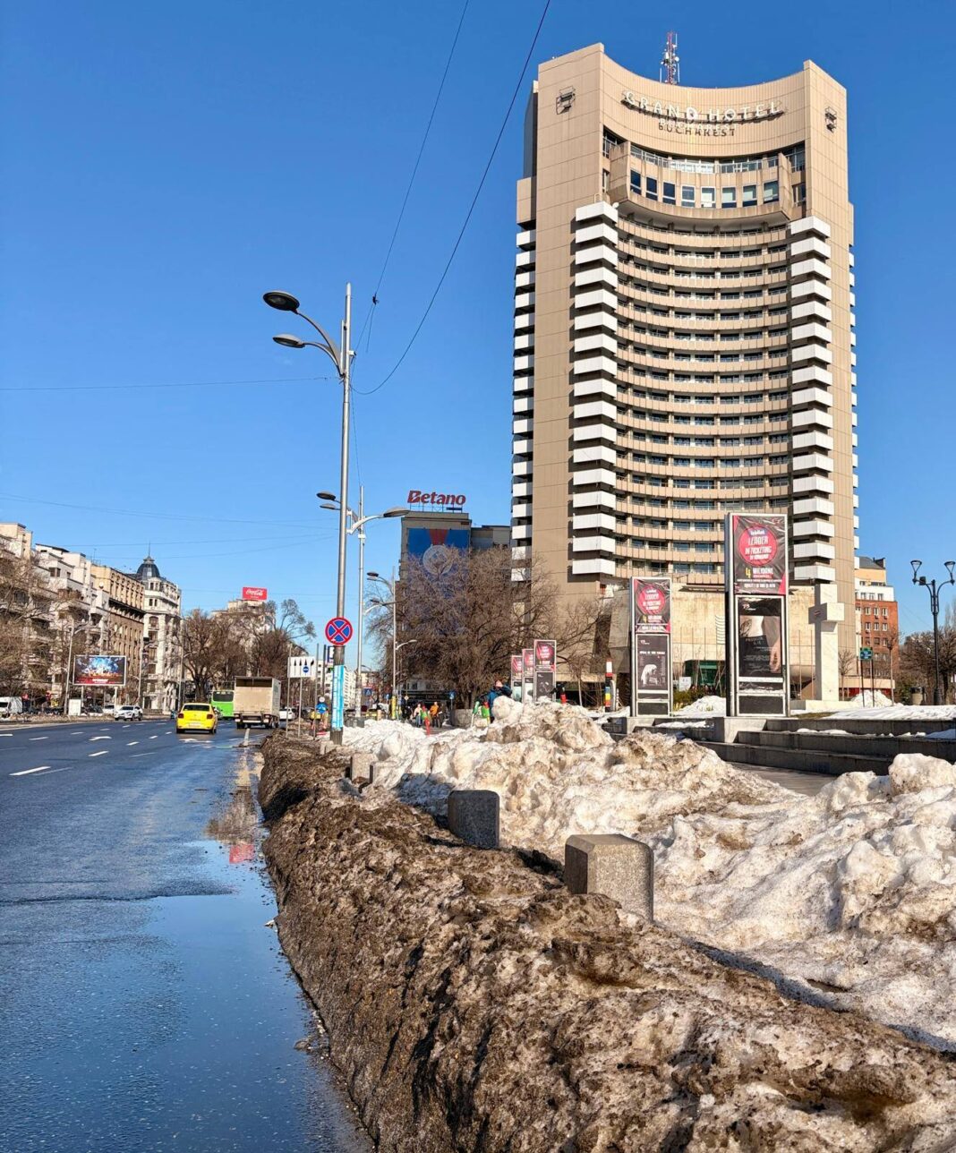 Primăria Capitalei a publicat o serie de imagini cu centrul Bucureștiului, încă predominat de munți de zăpadă, la o săptămână de la ultima ninsoare. Singura diferență este că acum „neaua” e neagră de mizerie.