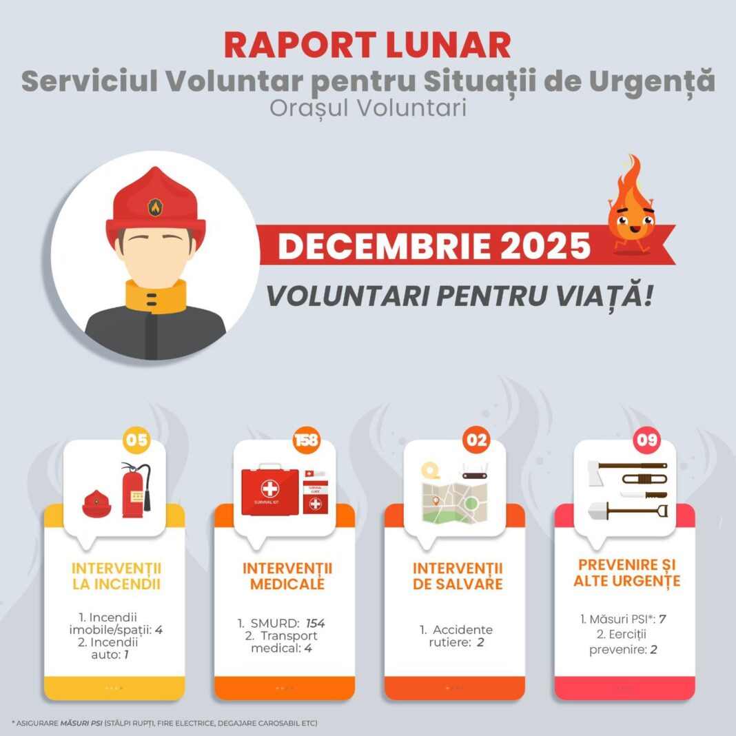 Luna trecută, echipele SVSU Voluntari au avut 5 intervenții la incendii, 158 de intervenții medicale, 2 de salvare și 9 acțiuni de prevenire și alte urgențe. La toate acestea, SVSU a răspuns prompt, a salvat vieți și a protejat bunuri materiale.