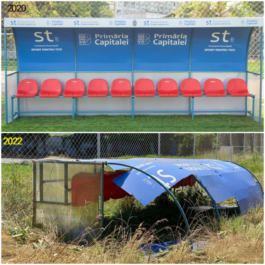 Ce a urmat? Imaginile surprinse „în teren”, și postate de gsp.ro, nu au nevoie de prea multe comentarii. Locul e părăsit, buruienile s-au instalat din nou, gazonul natural nu mai există, cel sintetic a fost distrus, iar băncile de rezervă arată jalnic, fiind rupte și prăbușite.