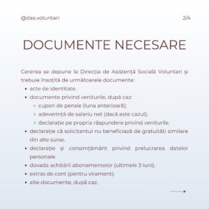 Cererile se depun la Direcția de Asistență Socială Voluntari, însoțite de documentele necesare, iar plata se face după verificarea îndeplinirii condițiilor legale. Documentele necesare sunt următoarele (foto):