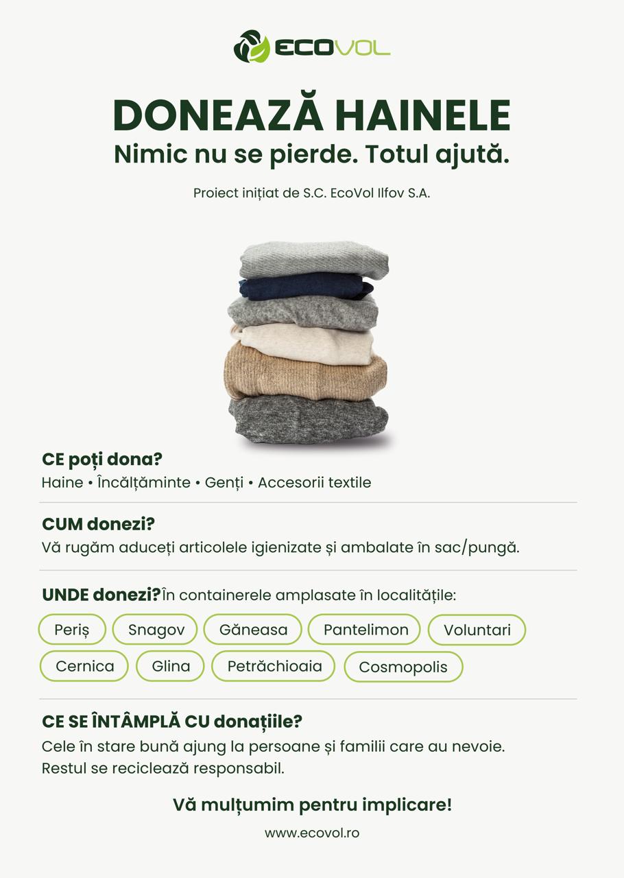 Societatea EcoVol Ilfov SA anunță o campanie de donare de haine în sprijinul persoanelor defavorizate. Sub egida „Donează hainele! Nimic nu se pierde. Totul ajută”, societatea își propune să colecteze obiecte de îmbrăcăminte și încălțăminte, genți și accesorii textile. Igienizate, ele ajung la persoane cu o situație materială precară.