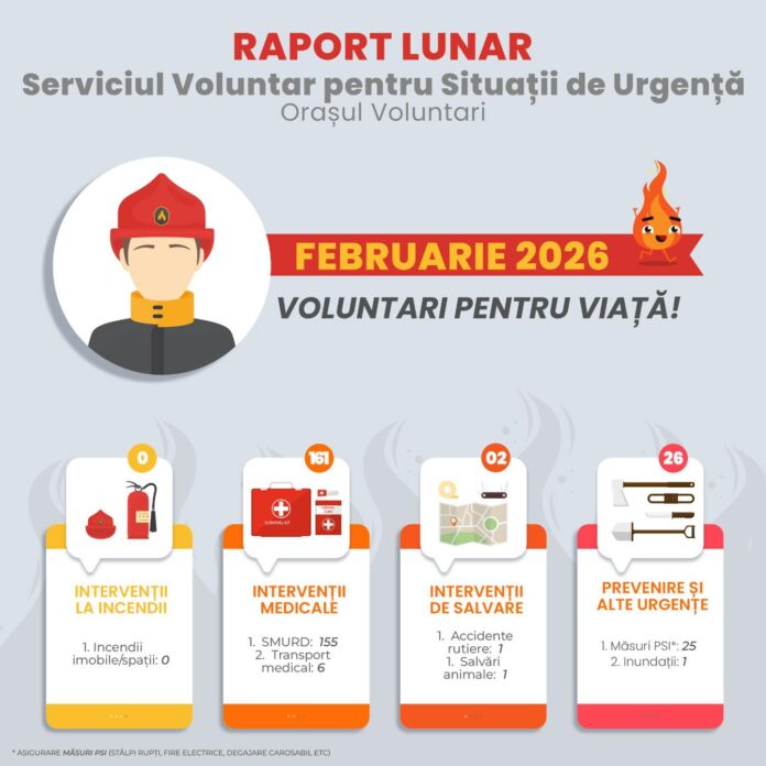 În luna februarie 2026, echipele de intervenție SVSU au acționat prompt pentru siguranța comunității, în umătoarele situații: intervenții medicale – 161, intervenții de salvare – 2, prevenire și alte urgențe – 32. Nu au fost înregistrate intervenții la incendii, o veste bună pentru toată lumea.
