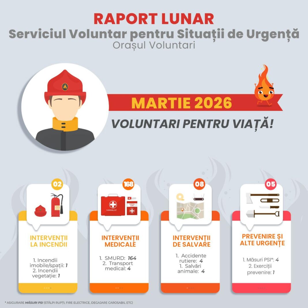 În luna martie 2026, echipele de intervenție SVSU au acționat prompt pentru siguranța comunității, în umătoarele situații: intervenții medicale – 168, intervenții de salvare – 8, intervenții la incendii – 2, prevenire și alte urgențe – 5.