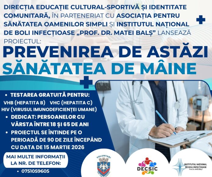 Programul se va desfășura pe o perioadă de 90 de zile, începând cu 15 martie 2026, și are ca obiectiv creșterea gradului de informare, prevenție și depistare precoce în rândul populației adulte. Hepatita B și hepatita C sunt infecții virale care afectează ficatul și pot evolua mult timp fără simptome, însă netratate pot duce la complicații grave, precum ciroza sau cancerul hepatic. HIV este un virus care atacă sistemul imunitar și, în lipsa tratamentului, poate slăbi treptat capacitatea organismului de a lupta împotriva infecțiilor.
