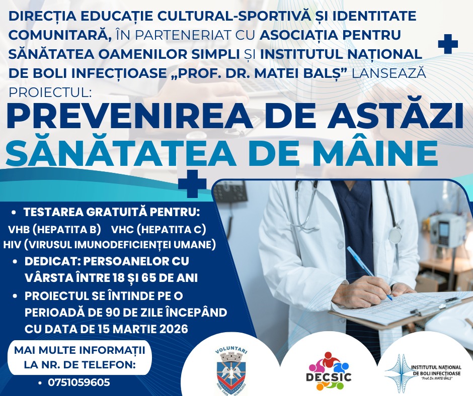 Primăria Orașului Voluntari în parteneriat cu Asociația pentru Sănătatea Oamenilor Simpli și Institutul Național de Boli Infecțioase „Prof. Dr. Matei Balș” lansează proiectul „Prevenirea de astăzi, sănătatea de mâine”. Anunțul a fost făcut de primarul orașului, Florentin Pandele. Proiectul oferă testare gratuită pentru hepatita B (VHB), hepatita C (VHC) și virusul imunodeficienței umane – HIV, destinată persoanelor cu vârste între 18 și 65 de ani din orașul Voluntari.