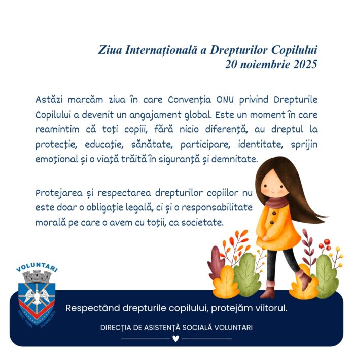 Direcția de Asistență Socială Voluntari (DASV) marchează Ziua Internațională a Drepturilor Copilului (20 noiembrie) cu un mesaj profund și un angajament ferm de respectare a drepturilor celor mici și protejare a viitorului tuturor.