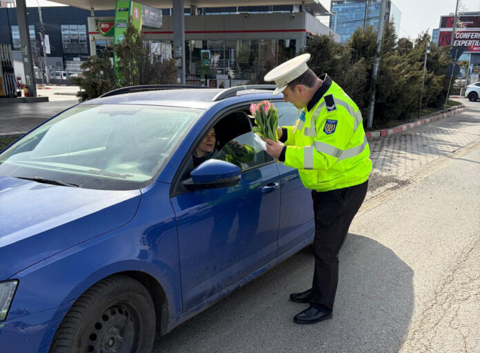Reprezentanți ai instituțiilor publice din oraș au oferit flori tuturor doamnelor și domnișoarelor care le-au ieșit în cale. Polițiștii au fost și ei la înălțime, dotați cu lalele și felicitări pe care le-au împărțit cu drag participantelor la trafic.