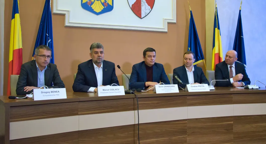 Marcel Ciolacu, președinte PSD, președintele Camerei Deputaților, Sorin Grindeanu, prim-vicepreședinte PSD, vice-premier, ministrul Transporturilor și Infrastructurii, Dragoș Benea, europarlamentar și vicepreședinte PSD, au susținut azi o conferință de presă, la semnarea contractelor pentru construcția celor 3 loturi ale autostrăzii Focșani-Bacău