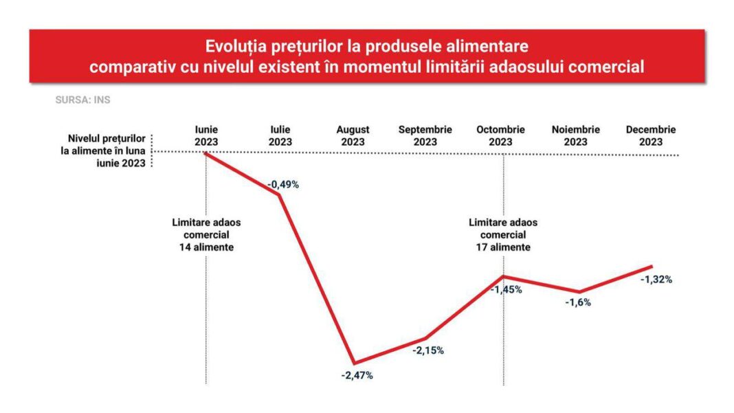 Dacă ne raportăm la momentul introducerii măsurii PSD de limitare a adaosului comercial la alimentele de bază, prețurile la produsele alimentare erau în luna decembrie mai mici cu -1,32% față de cele din luna iunie 2023.