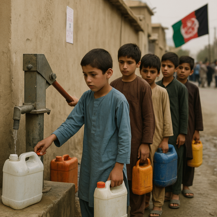 În Kabul, numeroase fântâni adânci s-au uscat și sursele subterane nu mai reușesc să satisfacă necesarul de apă al populației. Familiile sărace sunt nevoite să stea ore întregi la cozi la robinetele publice, iar copiii abandonează orele de școală pentru a aduce apă acasă.