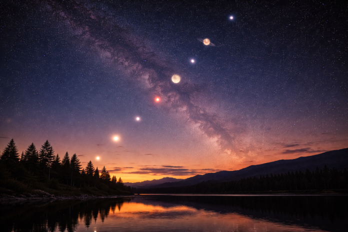 La finalul lunii februarie are loc un fenomen astronomic rar: șase planete pot fi observate aproape în linie pe cer. Mercur, Venus, Marte, Jupiter și Saturn pot fi văzute cu ochiul liber, iar Uranus poate fi observată cu ajutorul unui binoclu sau telescop.