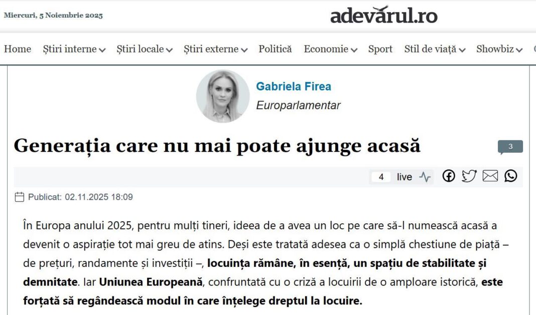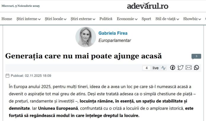 „Locuința este un Drept sau un Lux? Vă spun sincer, pentru unii tineri ideea de a avea o casă a devenit o iluzie. Prețurile la locuințe și chirii au explodat în ultimii ani. Nu mai e doar o chestiune de piață, ci de demnitate”, scrie europarlamentarul Gabriela Firea, pe pagina sa de Facebook.