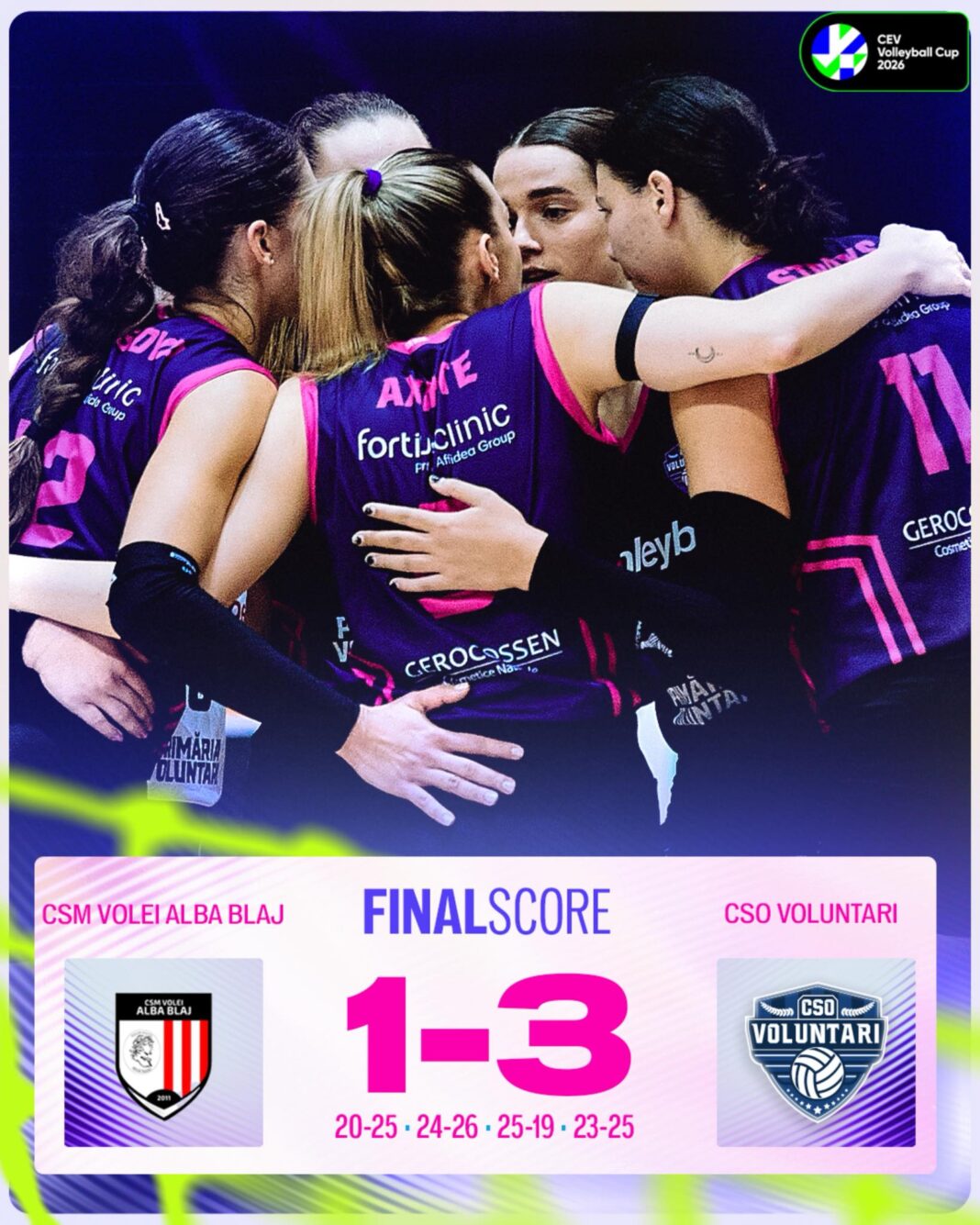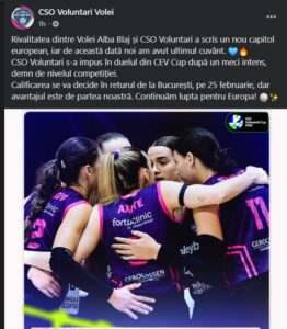 „Rivalitatea dintre Volei Alba Blaj și CSO Voluntari a scris un nou capitol european, iar de această dată noi am avut ultimul cuvânt”, a transmis echipa. „CSO Voluntari s-a impus în duelul din CEV Cup după un meci intens, demn de nivelul competiției”. Calificarea se va decide în returul de la București, pe 25 februarie, dar avantajul este de partea noastră. Continuăm lupta pentru Europa!”, au mai transmis fetele.