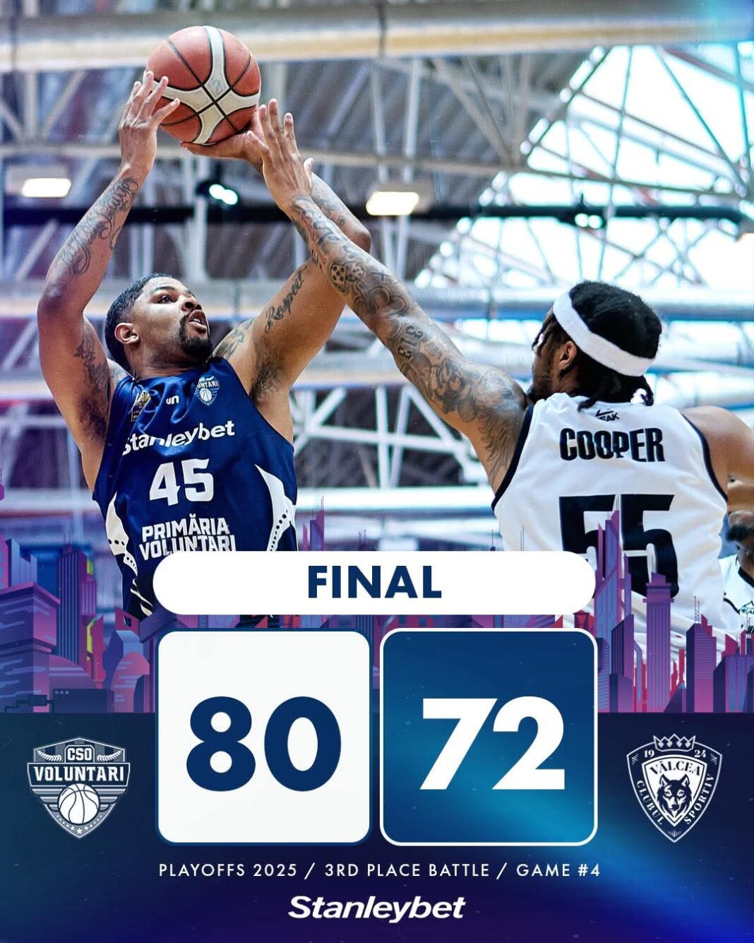 CSO Voluntari se menține în cursa pentru medaliile de bronz ale Ligii Naționale de Baschet Masculin (LNBM). Ilfovenii au reușit să câștige meciul patru al „finalei mici” și au egalat scorul la partide cu CS Vâlcea 1924, 2-2. Urmează meciul cinci, decisiv.