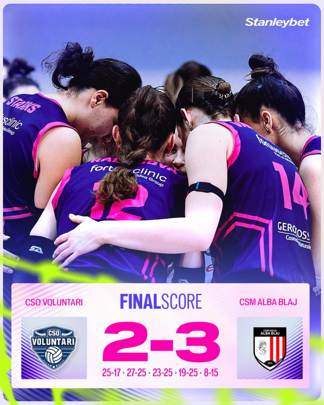 CSO Voluntari a luptat aprig, dar a părăsit terenul învinsă astăzi, în prima manșă a semifinalei Cupei României, disputată în compania rivalei CSM Volei Alba Blaj. Scorul a fost 3-2 pentru echipa oaspete. Returul va avea loc pe 4 martie, la Blaj.