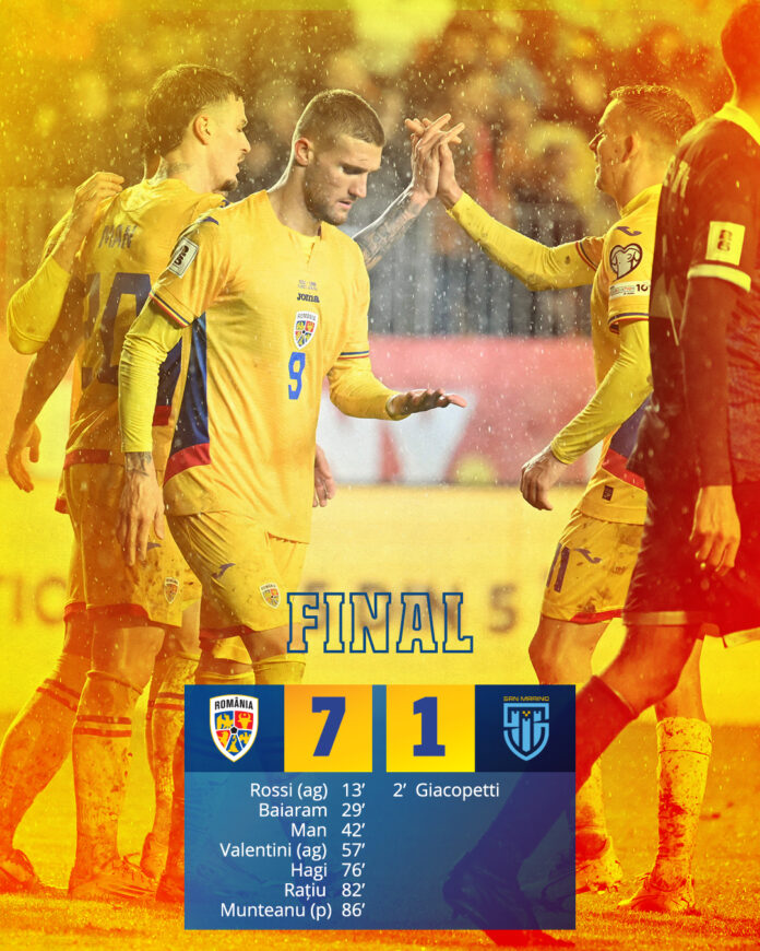 Echipa națională de fotbal a României a învins aseară, cu un categoric 7-1, selecționata statului San Marino, în ultimul meci al preliminariilor pentru calificarea la Campionatul Mondial de anul viitor din Canada, Mexic și Statele Unite.