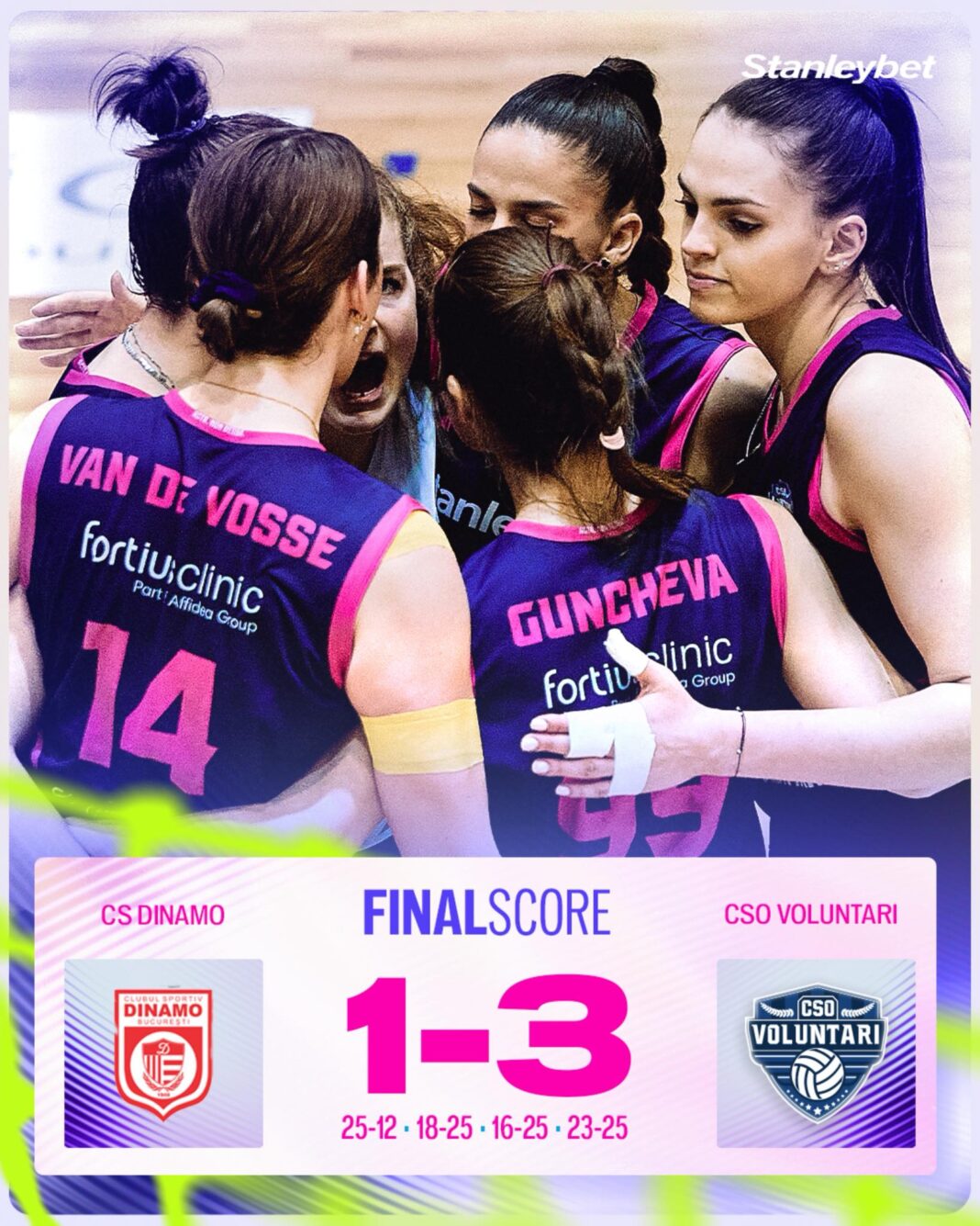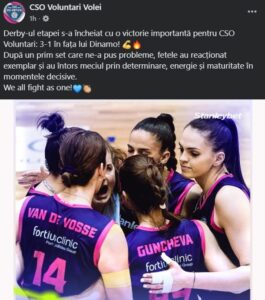 CSO Voluntari a câștigat meciul disputat în deplasare, în compania echipei Dinamo București, scor 3-1 (12-25, 25-18, 25-16, 25-23). A fost capul de afiș al etapei cu număru 15 a Diviziei A1, care a opus echipele aflate la egalitate de puncte pe locurile 2 și 3. Prin victoria de azi, CSO Voluntari și-a consolidat astfel poziția în clasament.