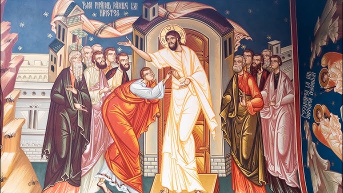 Imediat după Înviere, Hristos se arată apostolilor, intrând prin ușile încuiate (de frica iudeilor) și rostind binecuvântarea: „Pace vouă!” Din rândurile lor lipsea însă unul: Toma.