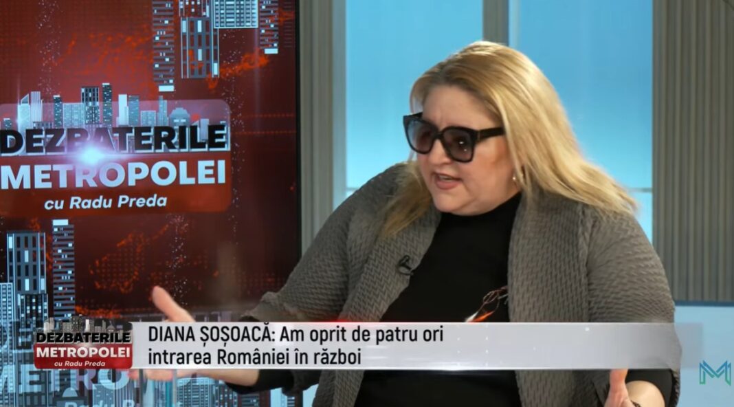 Invitată la „Dezbaterile Metropolei”, emisiune realizată de Radu Preda, Diana Șoșoacă a susținut că a intervenit personal de patru ori pentru a opri intrarea directă a României în războiul din Ucraina. Ea critică guvernul pentru sprijinul militar acordat Ucrainei și afirmă că scutul de la Deveselu este, de fapt, o armă îndreptată împotriva Iranului. Șoșoacă laudă condițiile de viață din Rusia, menționând prezența multor oameni de afaceri occidentali acolo, și sugerează că România a reintrat deja în sfera de influență rusă.