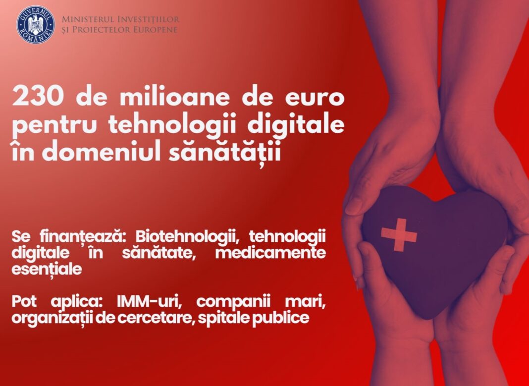 Printr-un nou apel de proiecte, lansat în cadrul Programului Sănătate, investim 230 de milioane de euro în soluții inovatoare ce vizează îmbunătățirea serviciilor medicale și accesul la tratamente moderne, cercetare aplicată, investiții productive în domeniul sănătății, inclusiv echipamente/ dispozitive/ componente utilizate pentru cercetare aplicată, dezvoltare și producție de medicamente critice enumerate în Pachetul Farmaceutic al UE, în vederea creșterii rezilienței sistemului de sănătate și îmbunătățirea accesului populației la îngrijiri medicale. Anunțul aparține Ministerului Investițiilor și Proiectelor Europene.