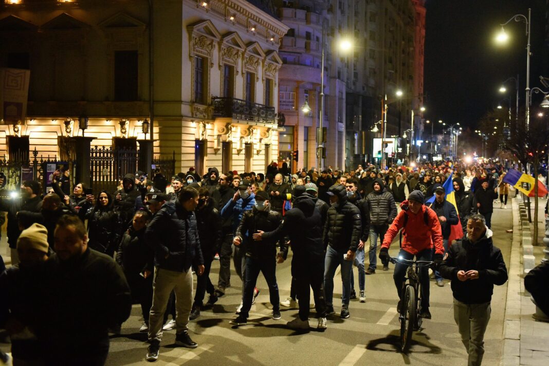 Sute de persoane, cu steaguri şi pancarte, au ajuns miercuri seara în Piaţa Victoriei, pentru a protesta împotriva restricţiilor impuse de autorităţi în contextul pandemiei de COVID-19.