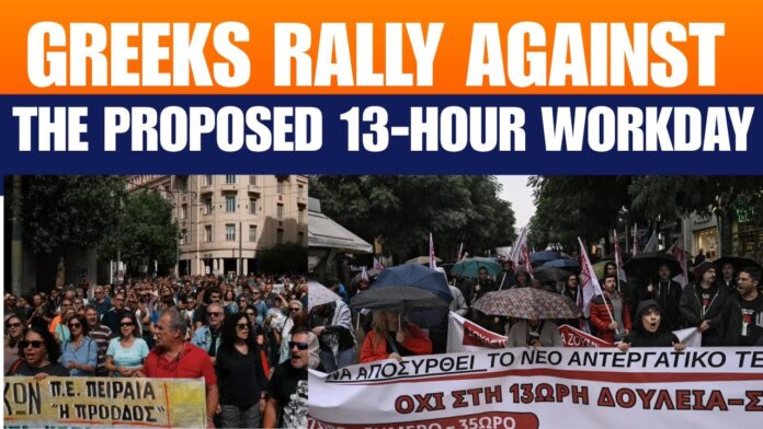 Proiectul care legiferează ziua de lucru de 13 ore a provocat mari proteste în Grecia. O grevă națională de 24 de ore a bulversat transportul feroviar și maritim.